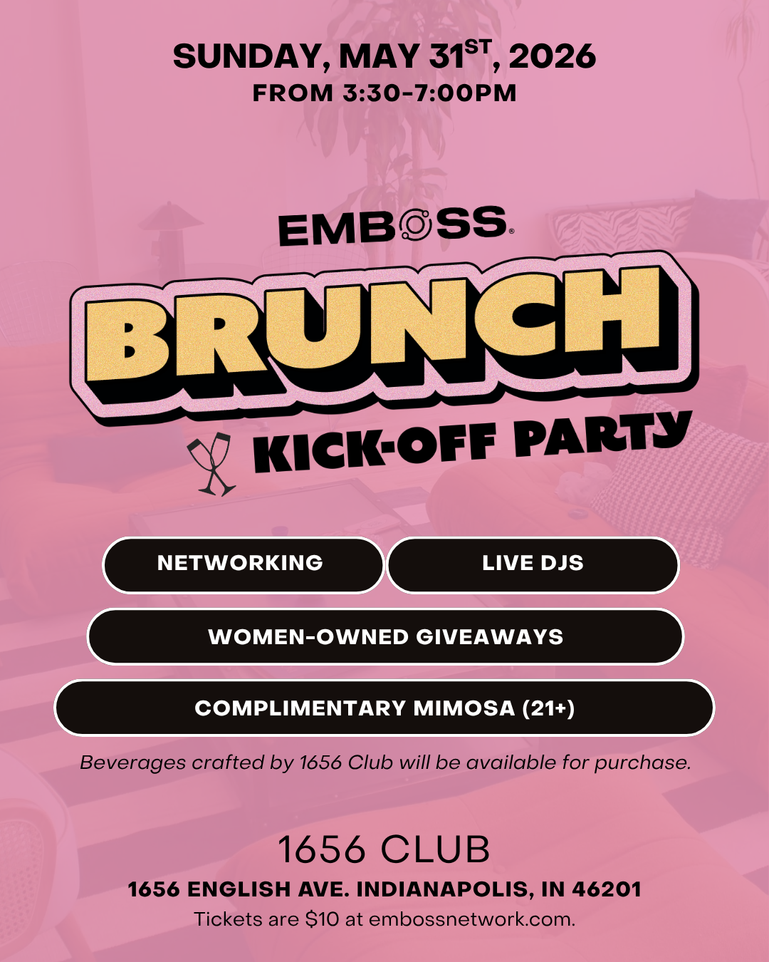 Join us at 1656 Club for the official kick-off to EMBOSS Signature Brunch Week! The Kick-Off Party is an open-house-style event, perfect for casual networking or a fun afternoon out on the town with your girls, setting the tone for the EMBOSS Signature Brunch the following Sunday.